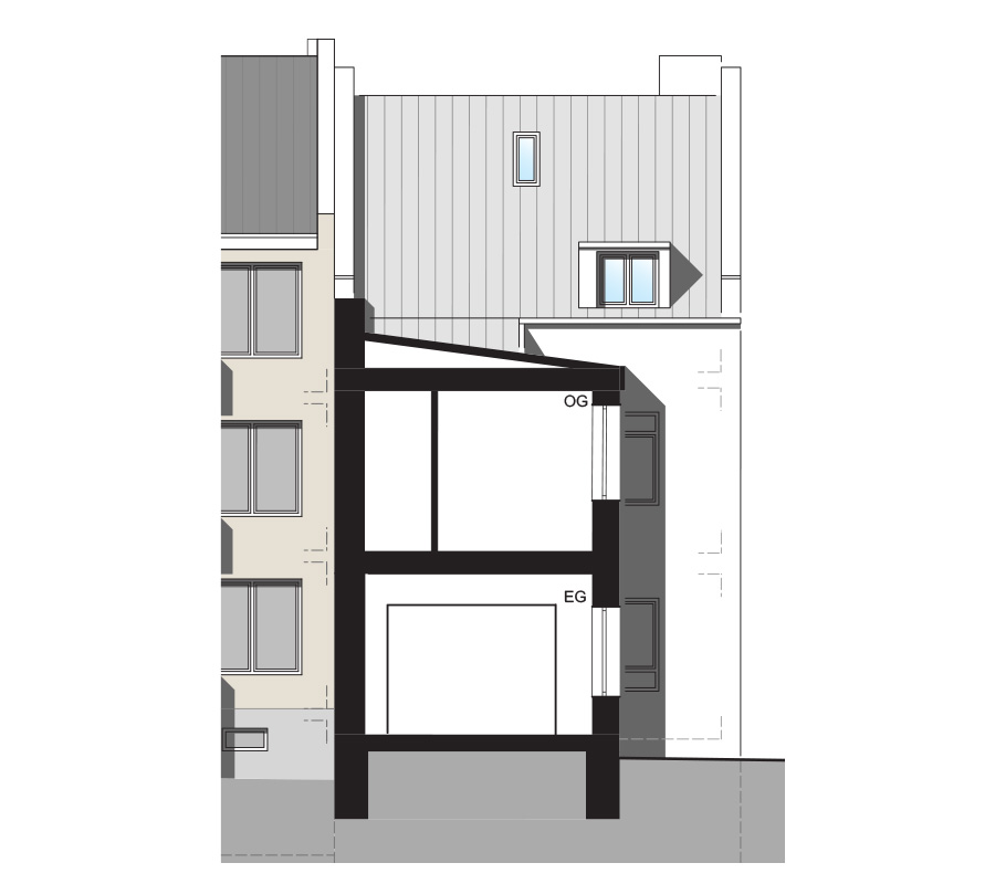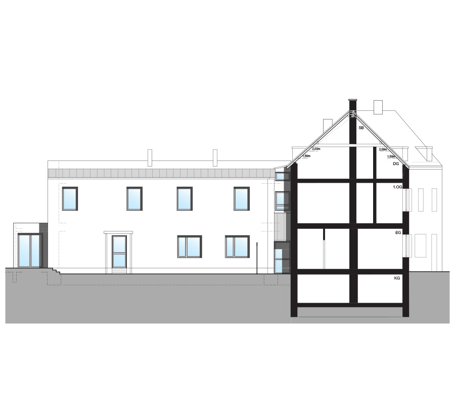 Den Gegenpol dazu bildet die großzügige Wohneinheit im hinteren Teil des Hauses: ein eigenständiges Einfamilienhaus mit separatem Eingang,