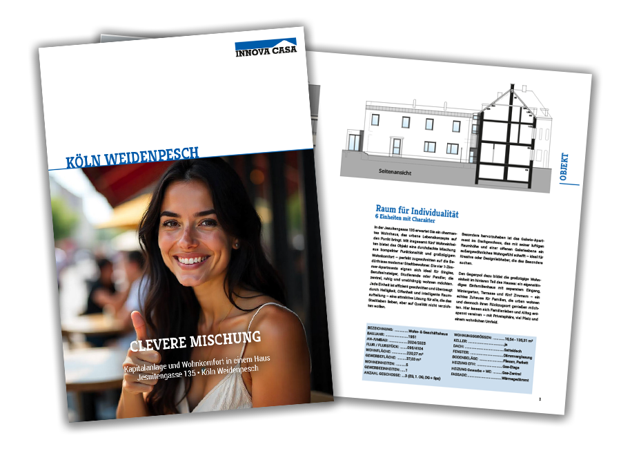 Die Jesuitengasse ist eine ruhige Seitenstraße mit charmantem Wohnumfeld und liegt dennoch in unmittelbarer Nähe zu wichtigen Verkehrsachsen. Der Stadtteil ist besonders beliebt bei Menschen, die das kölsche Veedelsgefühl schätzen, aber nicht mitten im Trubel leben möchten. Auch für Kapitalanleger ist die Lage interessant, denn Weidenpesch ist im Wandel – mit neuen Wohnprojekten, wachsender Infrastruktur und anhaltend hoher Nachfrage. Gleichzeitig bleibt der Charakter des Viertels erhalten: bodenständig, freundlich und gut angebunden.